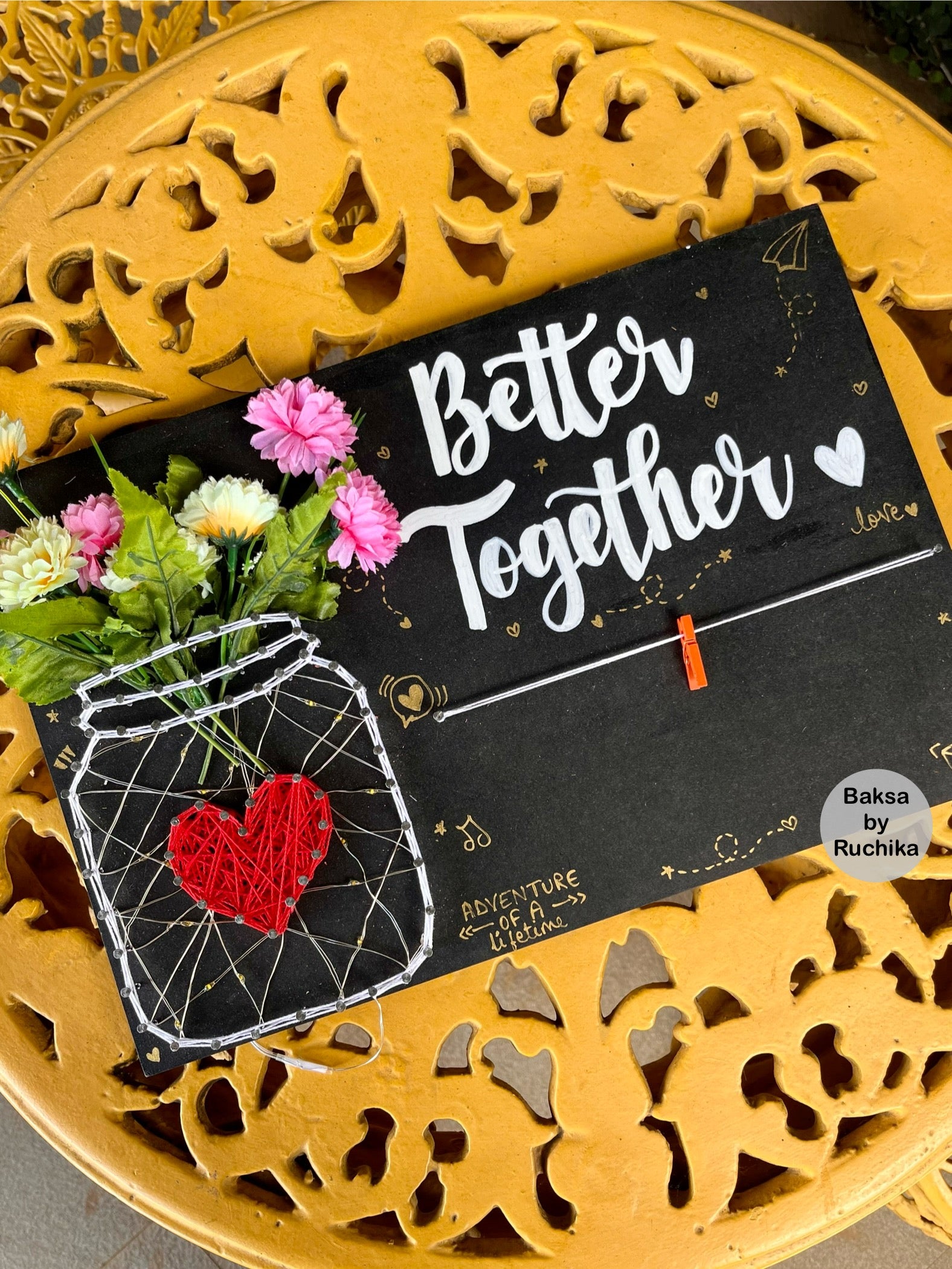 Celebrate love and togetherness with our Better Together String Art. Hand-crafted with intricate string art, this piece symbolizes the strong bond of love. Comes with a beautiful flower vase and the perfect space to attach cherished pictures. The ideal wedding or anniversary gift for a lasting memory.