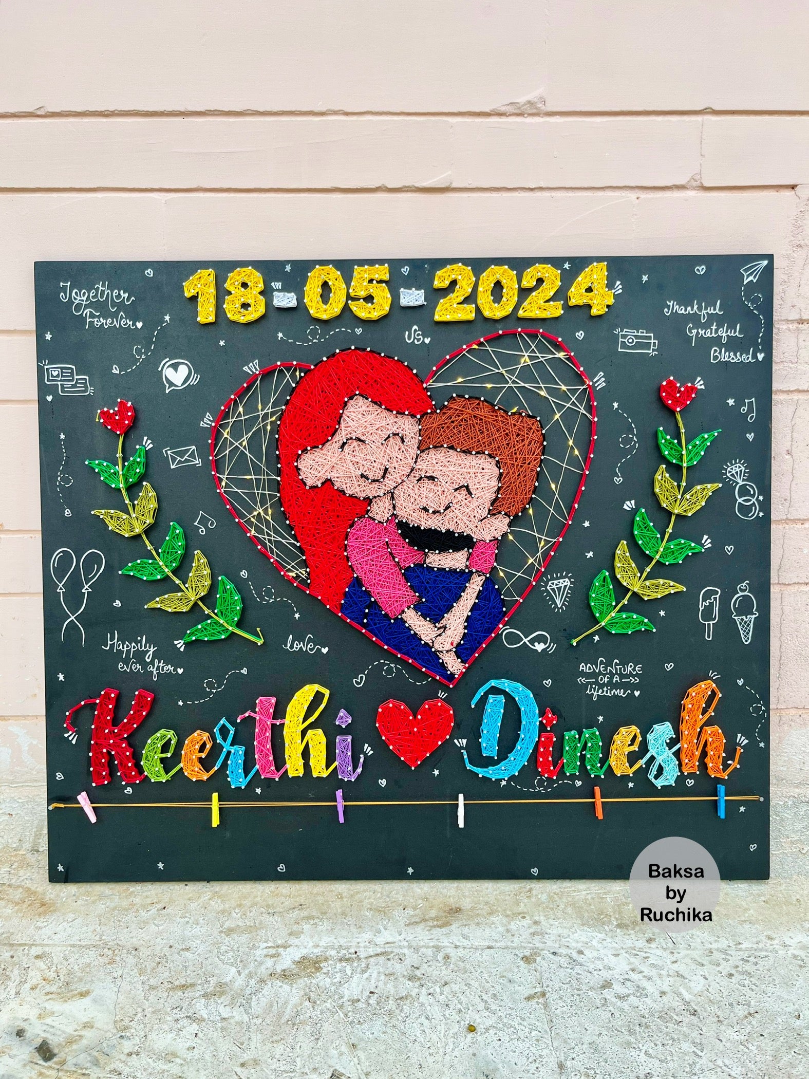 Celebrate your love with this unique Couple Illustration String Art. Personalize it with your names and special date. Leave room for hanging photos and enjoy the beautiful wreath design. Perfect addition to any room. Love it to the moon and back!
