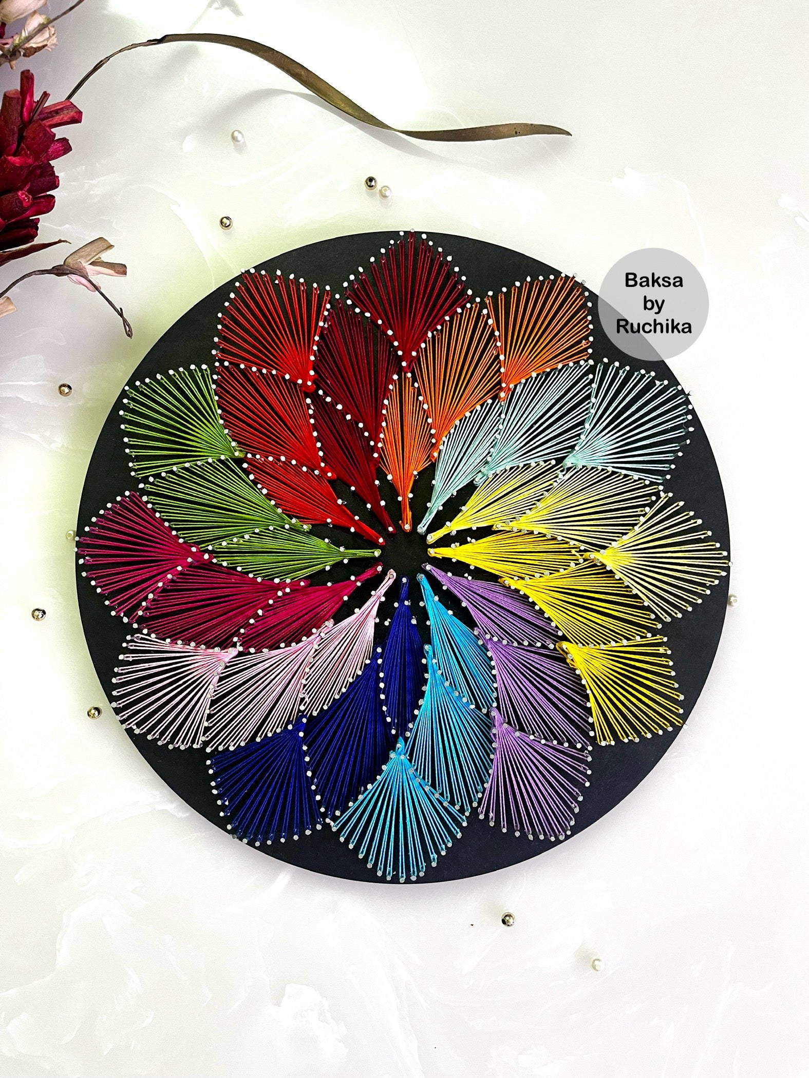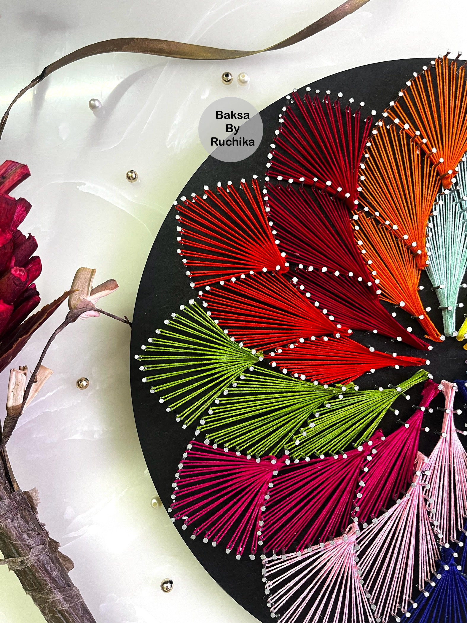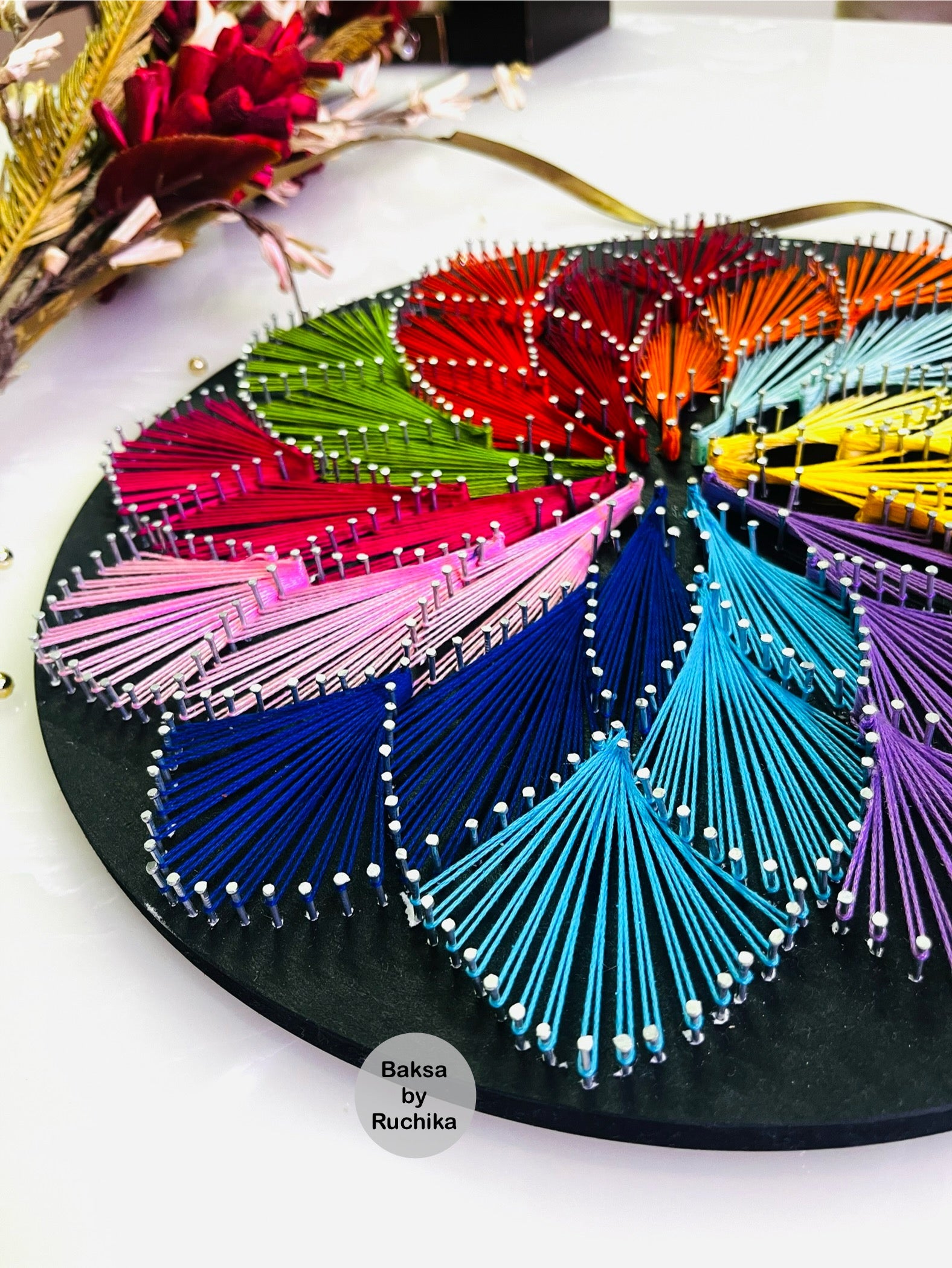 Add a touch of elegance and beauty to your home with our Diwali Rangoli String Art. This unique and aesthetic art piece will elevate the decor of any room. Perfect for showcasing during the festive season or year-round. Celebrate the art and tradition of Diwali with our exclusive string art.
