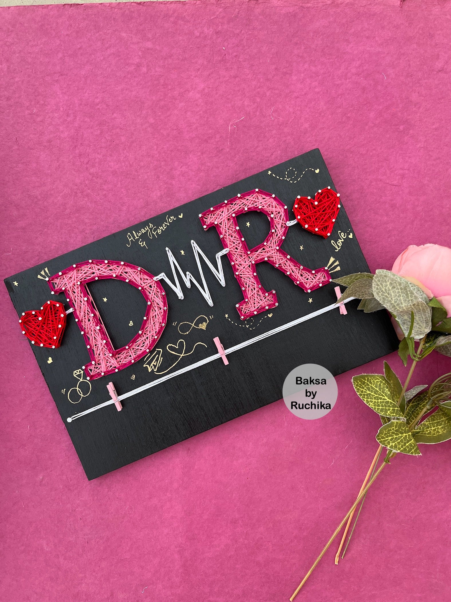 Add a personalized touch to any room with our Initial Name with Hearts String Art! With this unique piece, you can showcase your love and add your favorite photos below. (Pictures not included)