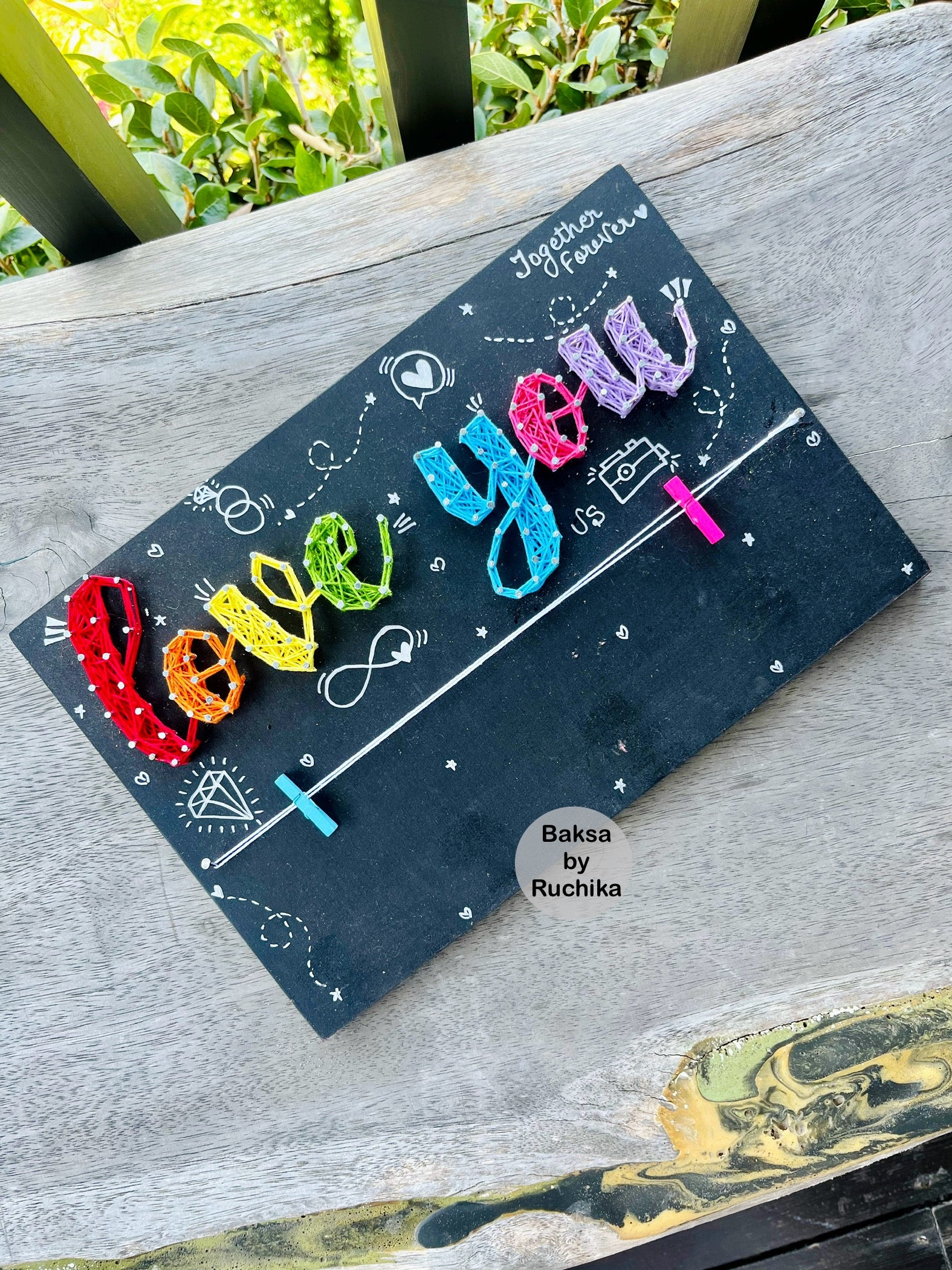 Indulge in the beauty of our Love You String Art, a stunning display of thread art and nail string art. Perfect as a couple's gift, this unique piece will add an elegant touch to any room. Show your love in a tasteful and exclusive way with our Love You String Art.