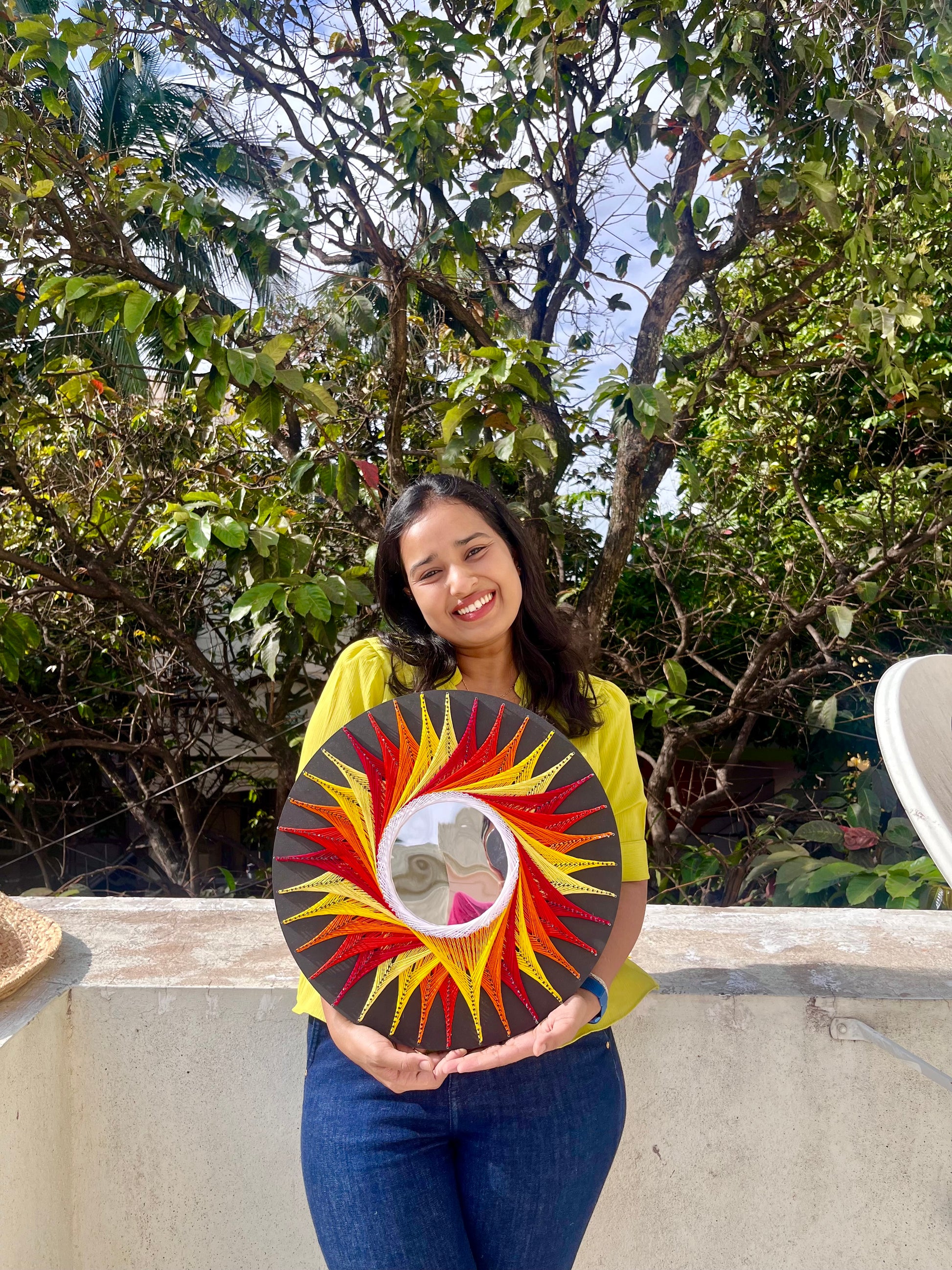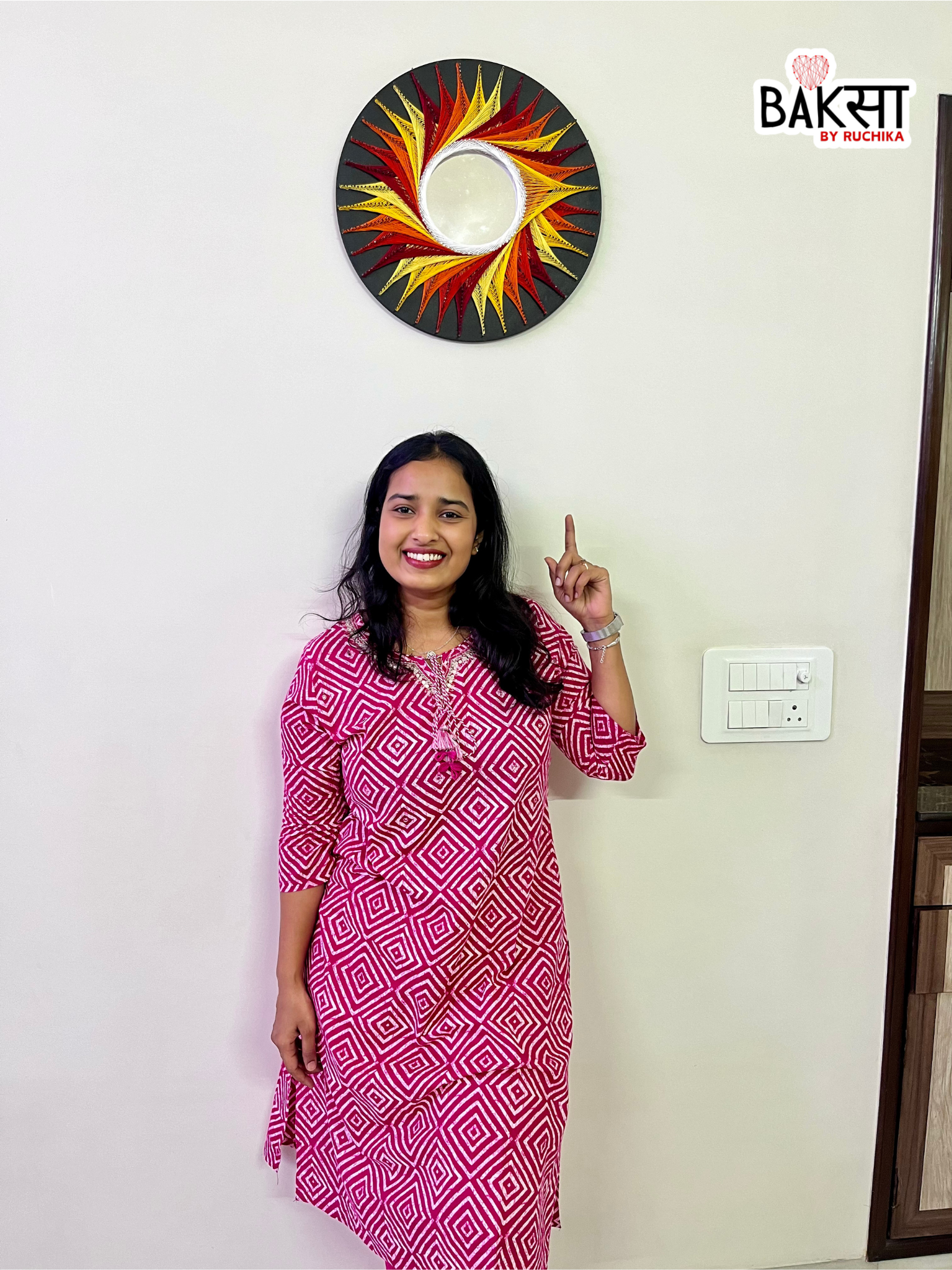 This handcrafted mirror string art adds a touch of elegance to any home decor. The geometric design, inspired by the vibrant colors of traditional Diwali decor, elevates any space into a work of art. Perfect for adding sophistication to your walls or as a unique gift.