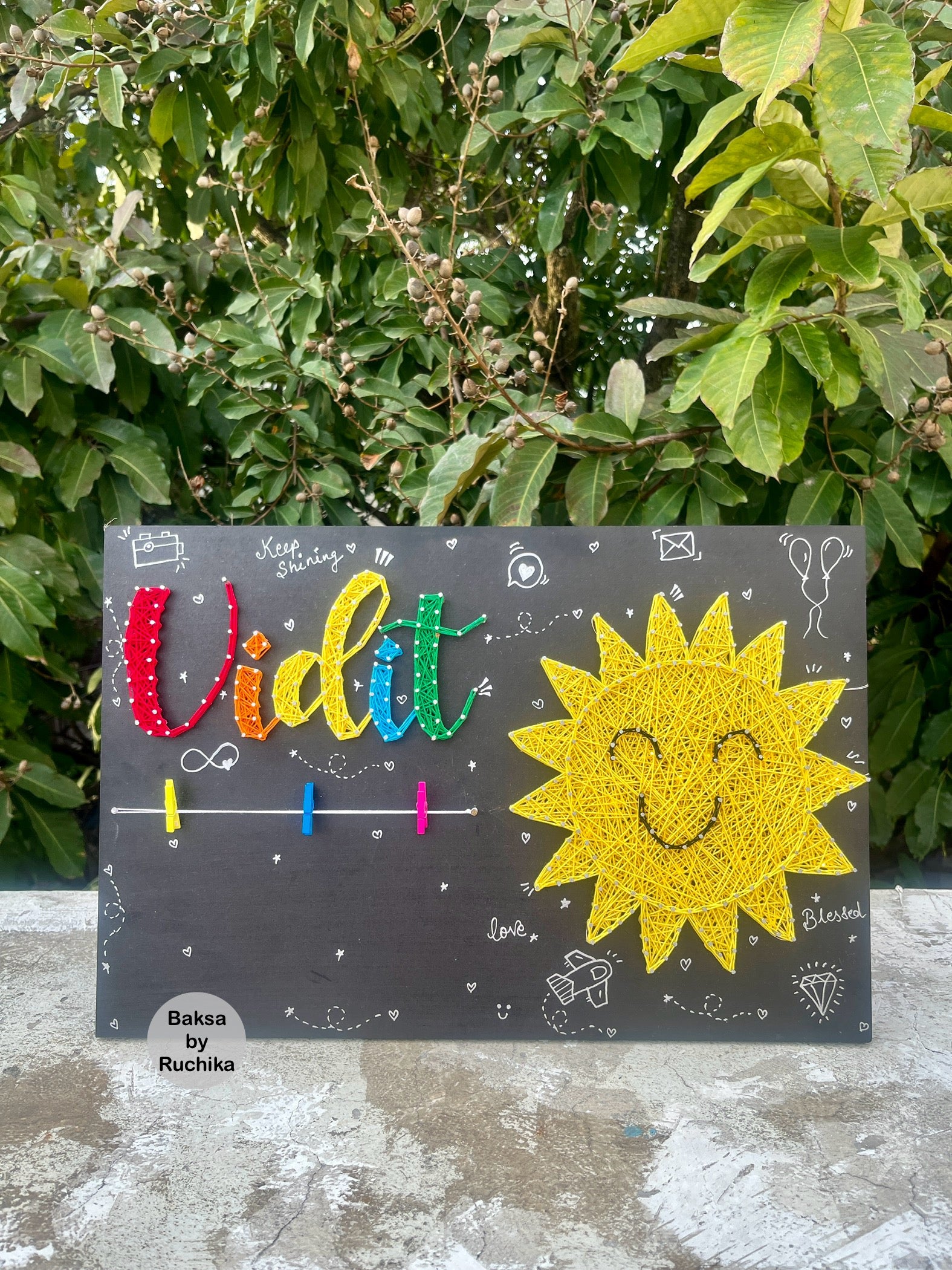 Add a personalized touch of sunshine to your space with our Sun with Customized Name String Art. Featuring a unique pic space below, this piece is sure to brighten up any room. No matter the name, this sun shines equally bright!