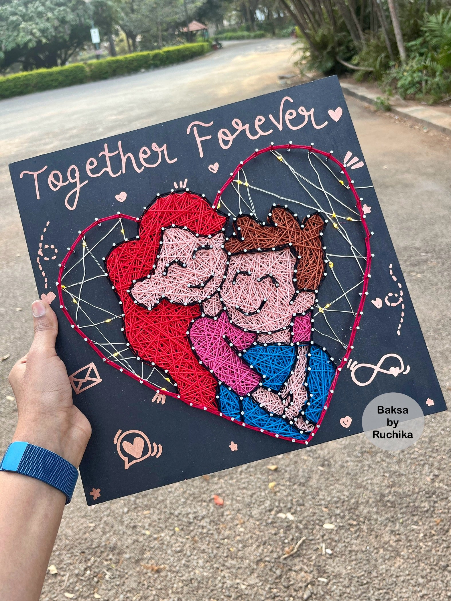 Get ready to add some romantic ambiance to your home with our Together Forever Couple Illustration String Art with Jar Lights! This unique piece of home decor features an adorable illustration of a loving couple surrounded by delicate string art and warm glowing jar lights.